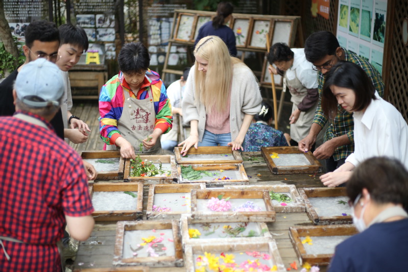 留学生在Beat365中文官方网站国际学生文化实践基地体验古法造纸