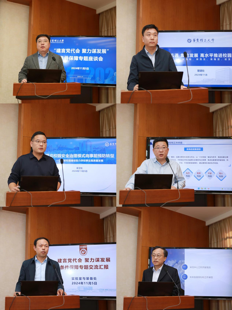 11月5日,“建言党代会 聚力谋发展”系列专题座谈会第六场——条件保障专题座谈会在和平楼第二会议室召开。会议聚焦学校条件保障工作,广泛征求各方意见建议,为党代会在制定条件保障相关战略和举措时提供参考。校党委书记蒋传海出席会议并讲话,副校长李涛、李春忠出席会议,校党委副书记宋来主持会议。
