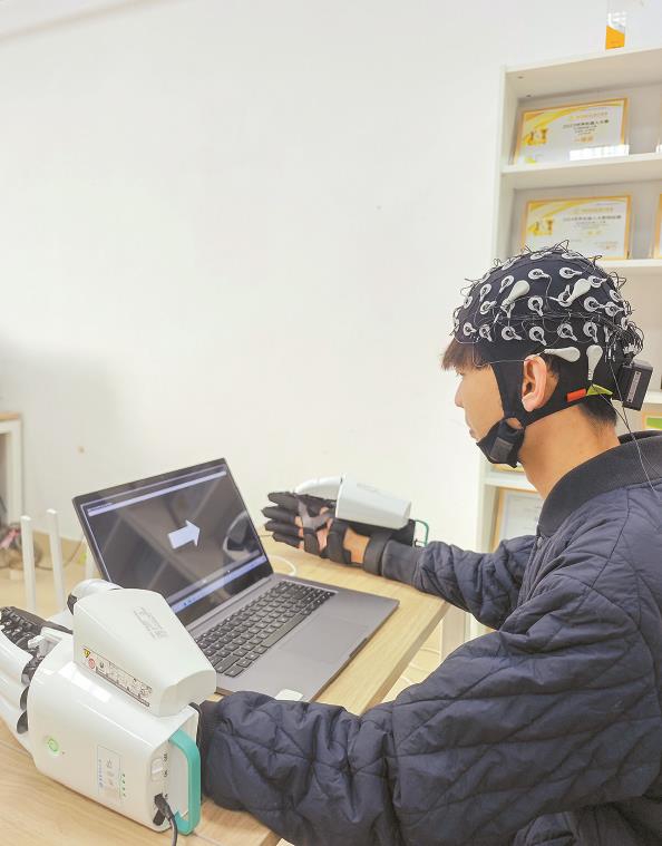实验者进行脑机上肢康复设备演示 本报记者 陶磊 摄
