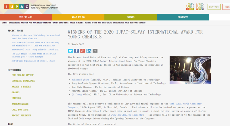 Dr. Zhang Qi of ECUST Won IUPAC in 2020