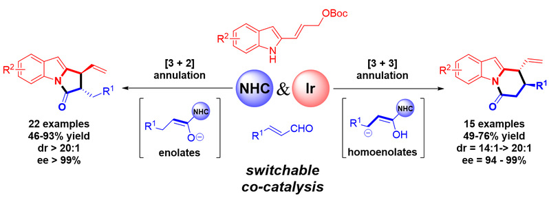 Recently, the research team of Professor Deng Weiping of Shanghai Key Laboratory of New Drug Design of the School of Pharmacy, ECUST, has made the latest progress in the research of asymmetric divergent cycloaddition reaction catalyzed by iridium and azacarbene. The research article was published in ACS Catalysis, a journal of catalysis of American chemical society, under the title of “Cooperative N-heterocyclic Carbene and Iridium Catalysis Enables Stereoselectiveand Regiodivergent [3 + 2] and [3 + 3] Annulation Reactions”.