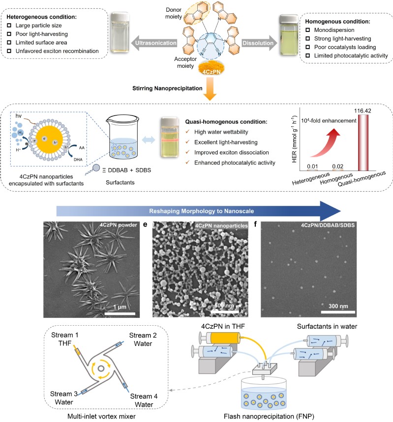 Recently, Academician Zhu Weihong and Specially Appointed Researcher Zhang Weiwei from ECUST researched on an innovative molecular nano-photocatalyst based on a donor-acceptor structure for high-efficiency quasi-homogeneous photocatalytic water splitting for hydrogen production. The related research article was published in the prestigious journal Advanced Materials under the title “Efficient Quasi-Homogenous Photocatalysis Enabled by Molecular Nanophotocatalysts with Donor-Acceptor Motif”.