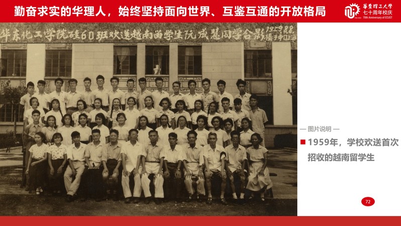“惟其艰难,才更显勇毅,惟其笃行,才弥足珍贵。”建校70年来,不论是艰苦创业的筚路蓝缕、直面改革的坚韧以行,还是投身新时代的波澜壮阔,一代代华理人伴随着新中国的发展,始终保持不畏艰险、锐意进取的奋斗韧劲,风雨兼程、披荆斩棘、砥砺前行,在新中国高等教育史上谱写了与祖国同行、与时代共进的壮丽篇章。